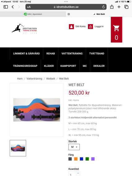 FUNKTION. Våtvästen är en speciellt konstruerad våtväst för löpning, träning och rehabilitering i vatten utan att bottna (djupvattenträning). Västen skall sitta bekvämt åtsittande och helt bära kroppens vikt.